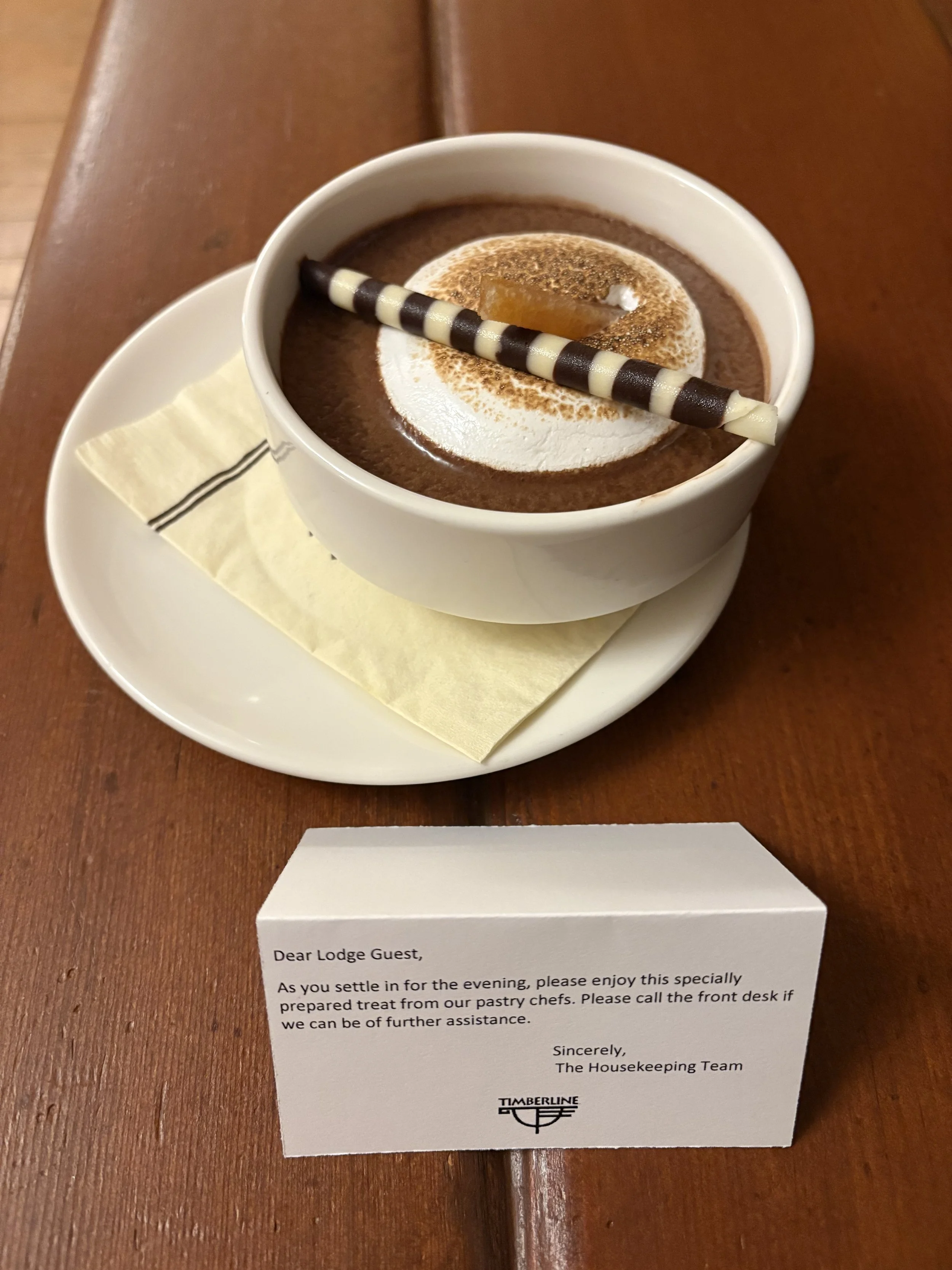 Once upon a time, grand hotels partnered with famous chefs to create the best restaurants in the world. Dinner at Timberline’s Cascade Dining Room is a dining experience worthy of that tradition: its wine program, piping hot Porcini Bisque, thick King Salmon with crackling skin and butter-soft orange flesh, were impressive. Back in our room, a turn-down surprise awaited: chocolate mousse.