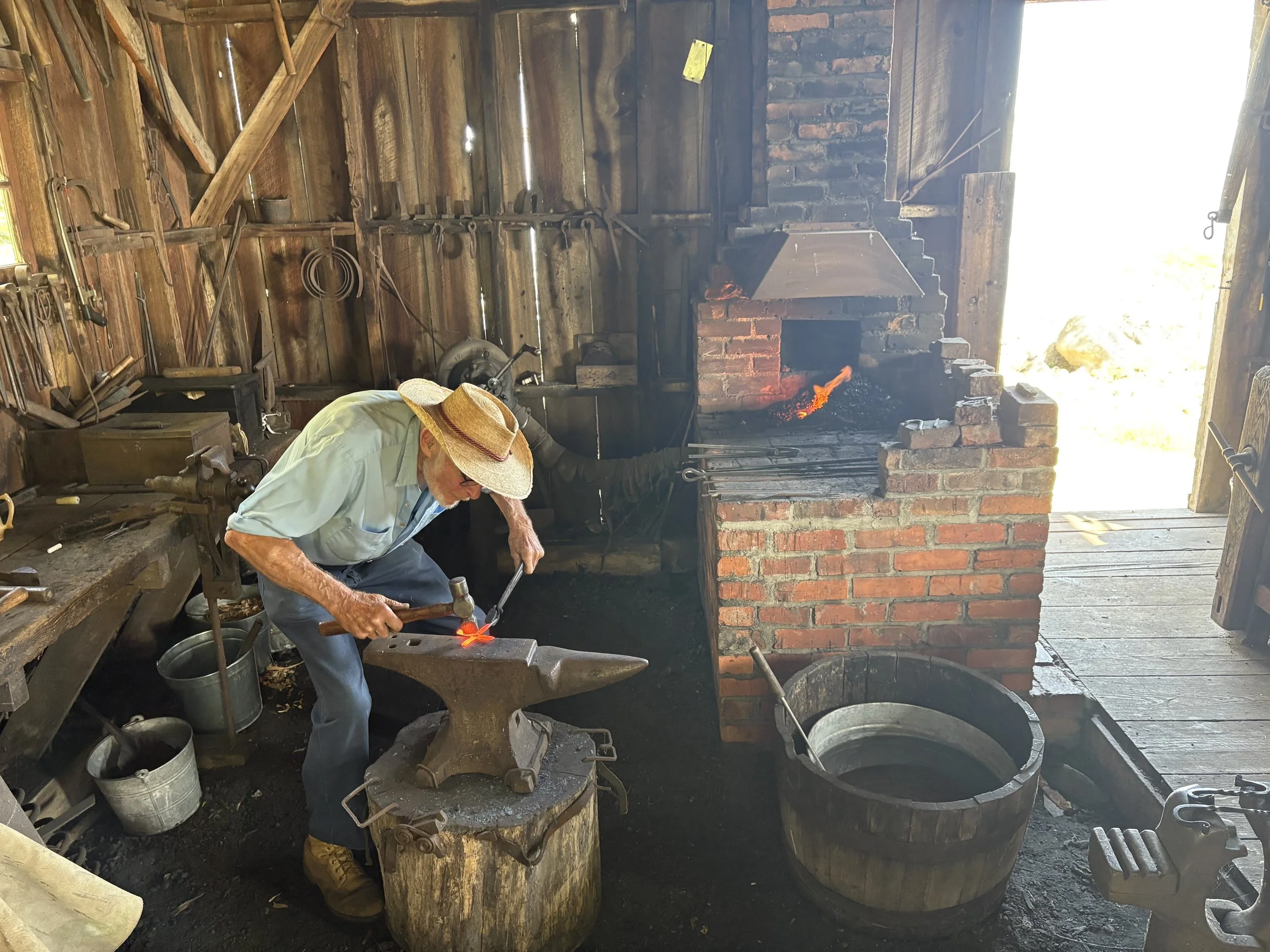 Outside, volunteers in period 1800s costumes dotted the property, carrying out the homestead’s goal – allowing visitors to experience the crafts of the era in which it was built. Inside the blacksmith shop, Julius Langpeter demonstrated his skills. Grabbing a piece of iron with tongs, he held it over anthracite coal burning in the forge. Emerging a glowing crimson red, the iron was reshaped before our eyes, with Langpeter explaining the process as he worked. As a young boy, he apprenticed in a blacksmith shop in Esslingen am Neckar near Stuttgart, Germany. Now retired, he shares his rare expertise with us.